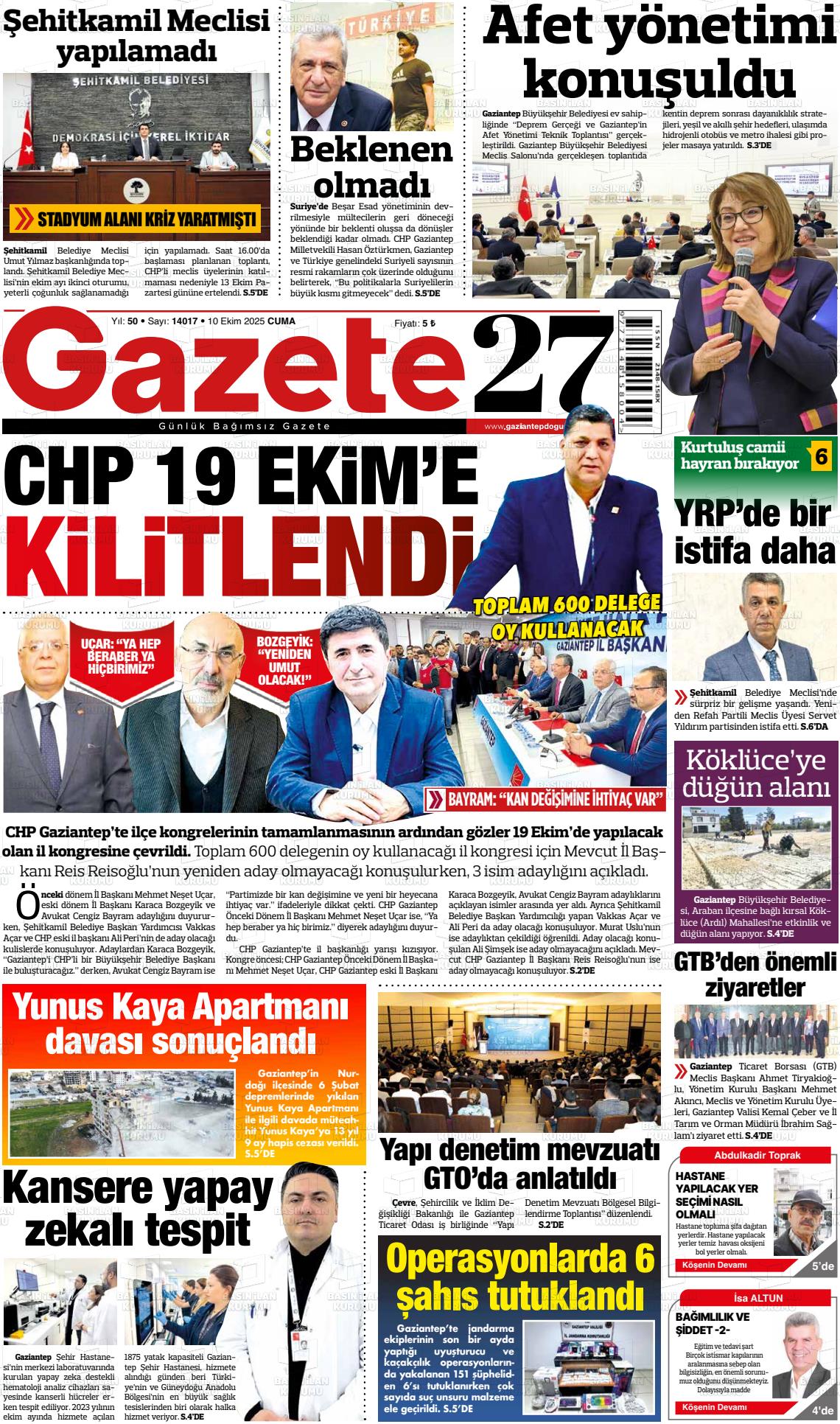 Gazİantep Yerel Gazeteleri 27 Ocak 2026, Salı Günü Manşeti